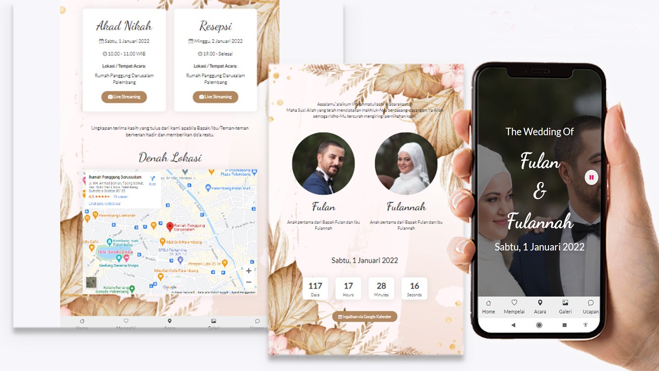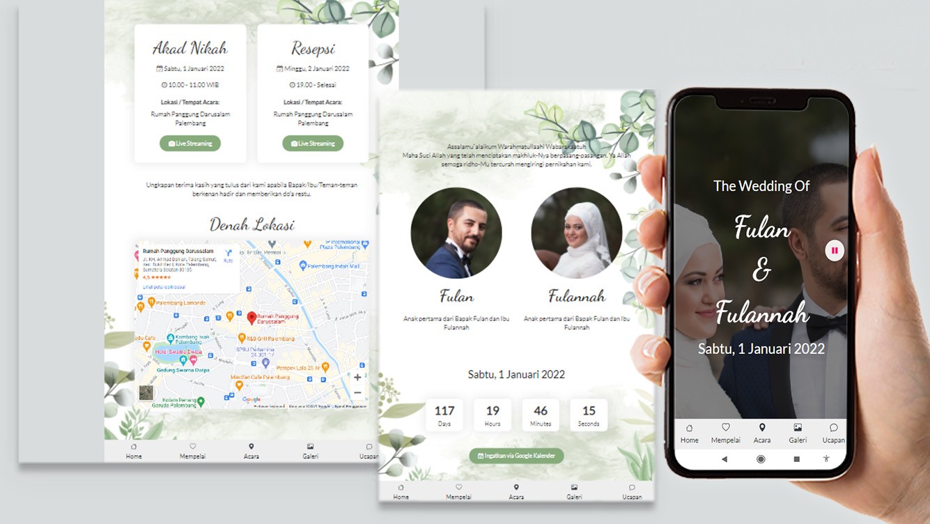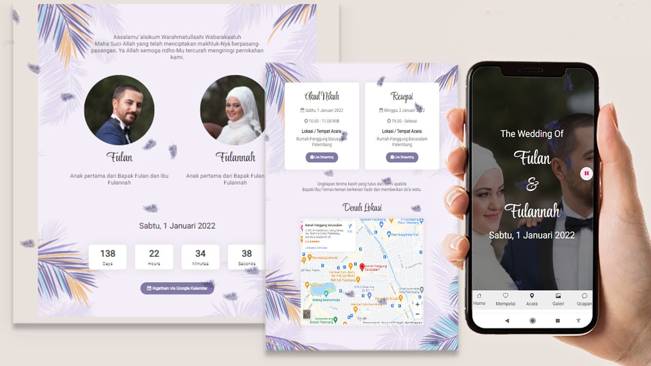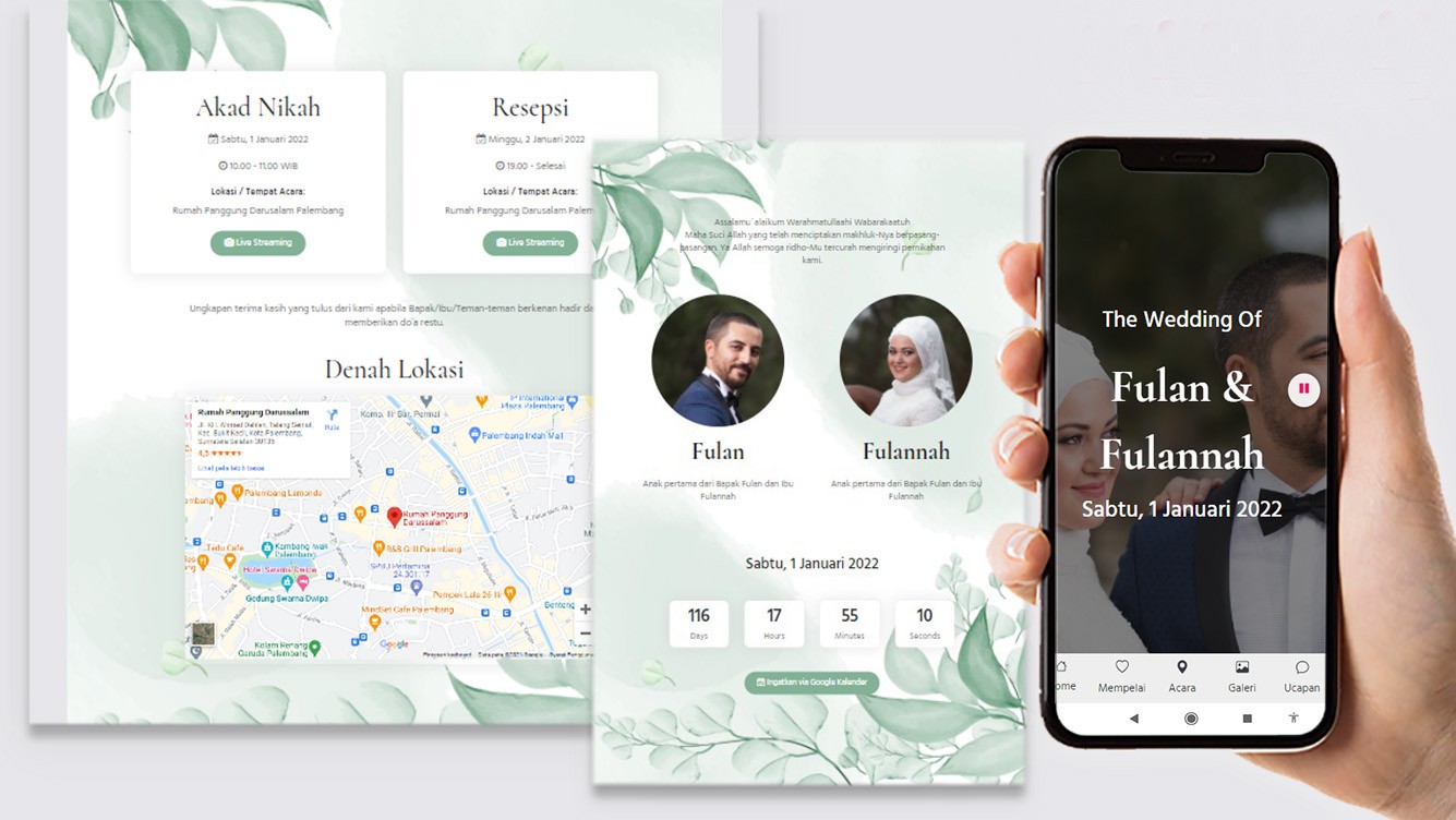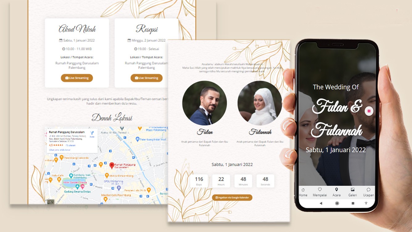 Menampilkan detali acara (akad & resepsi) mulai dari tanggal, jam dan lokasi acara.