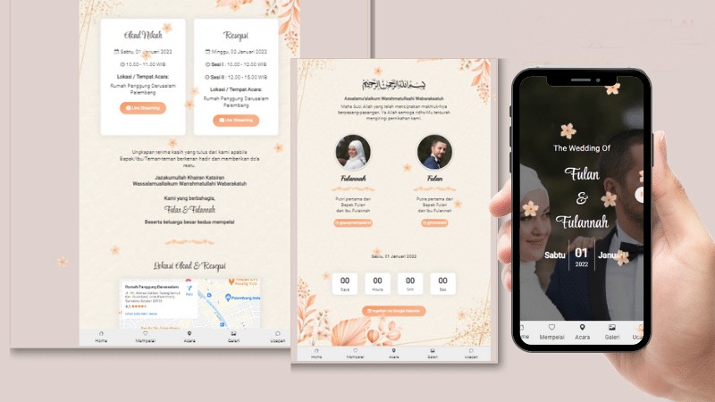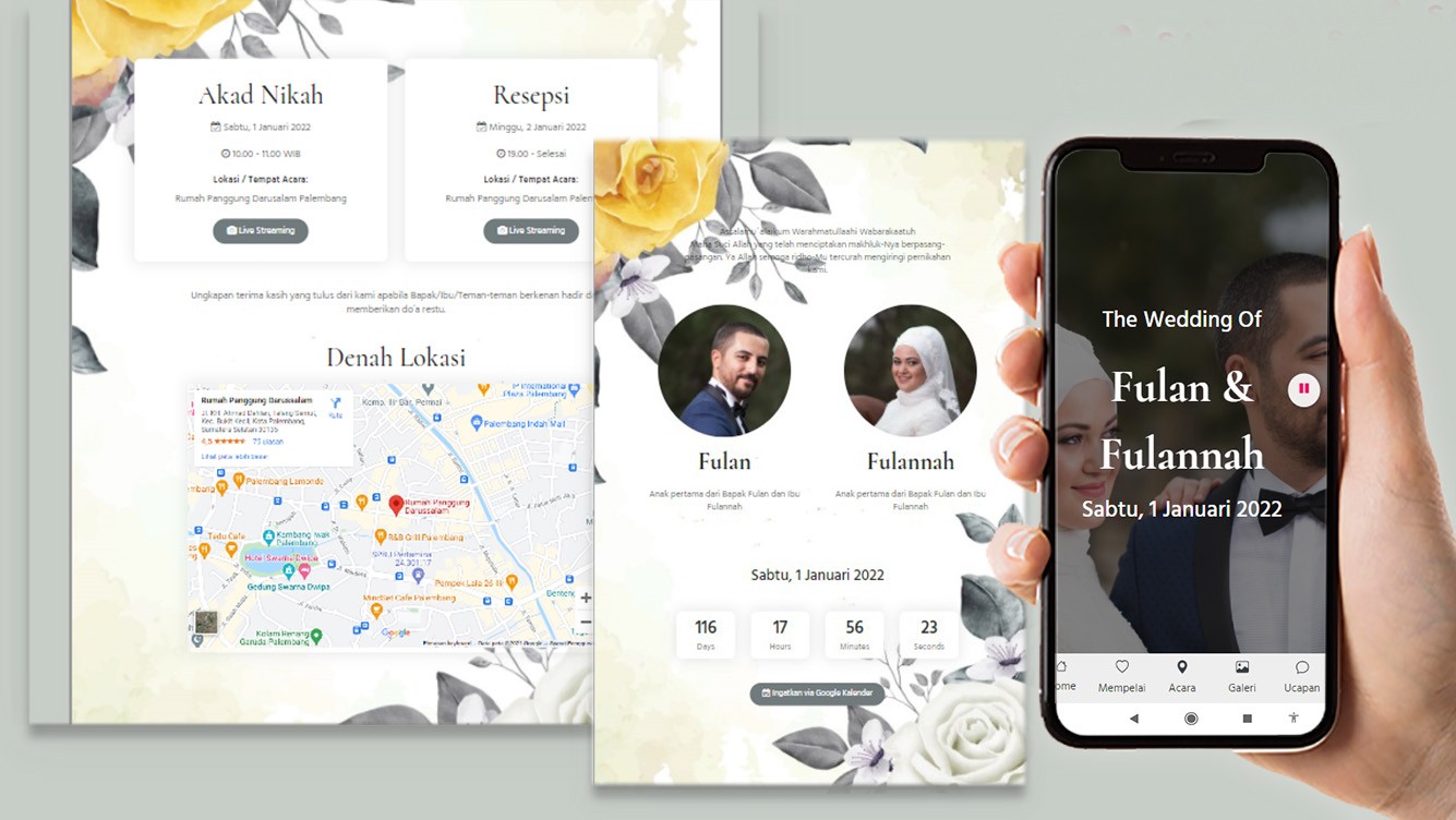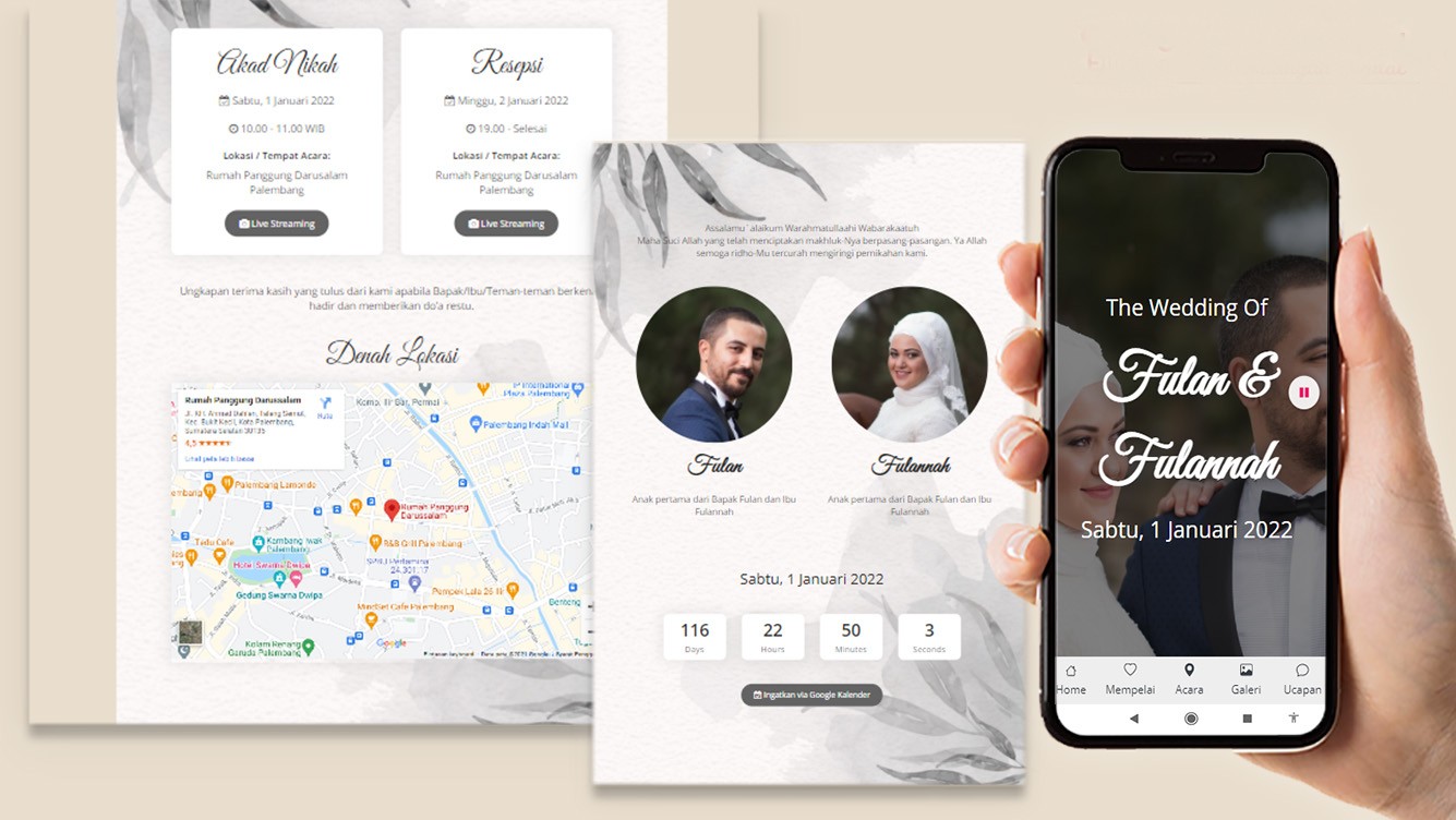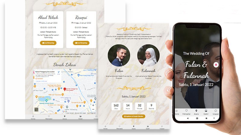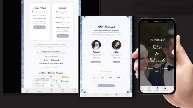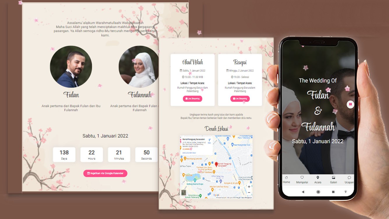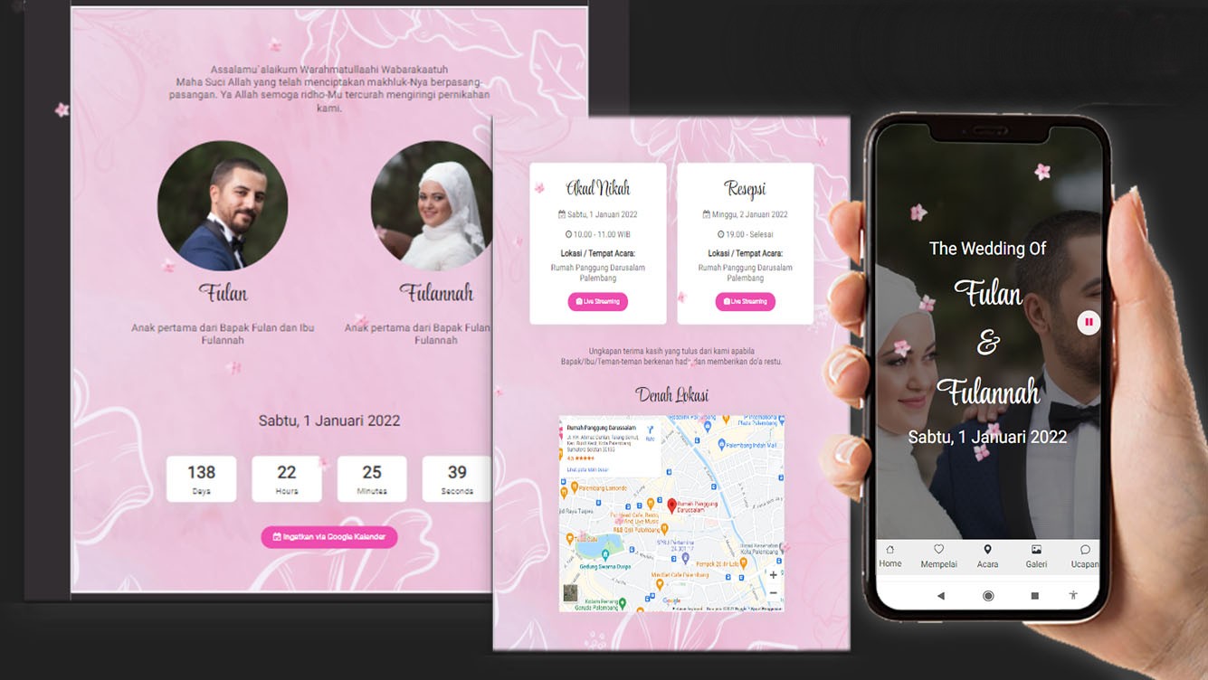 Menampilkan detali acara (akad & resepsi) mulai dari tanggal, jam dan lokasi acara.