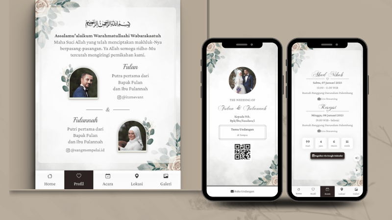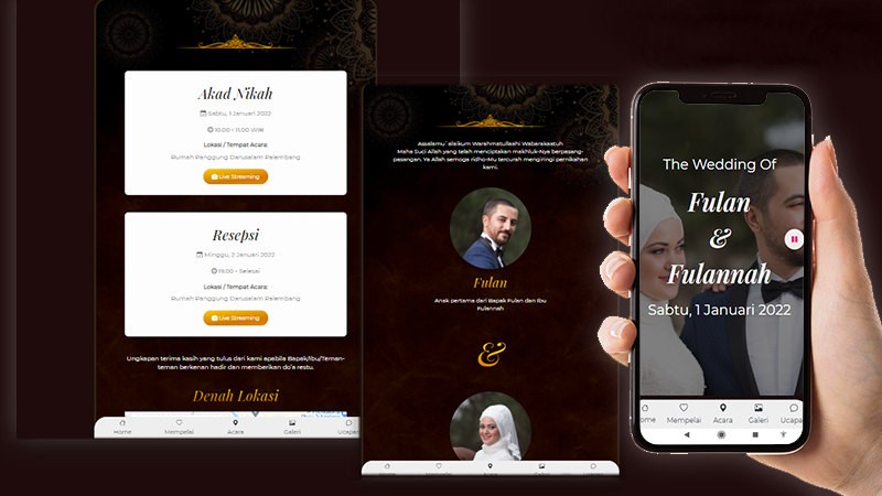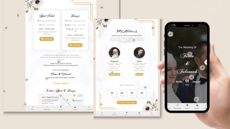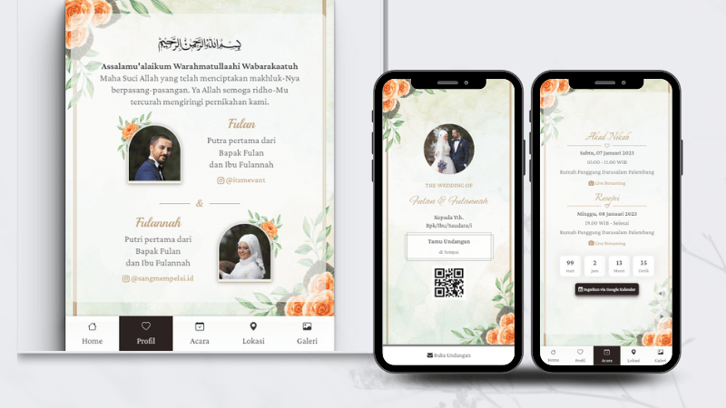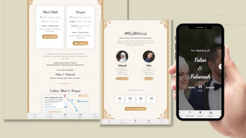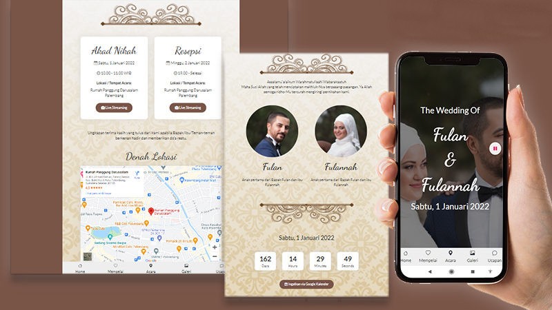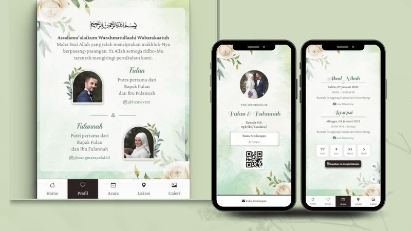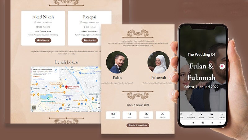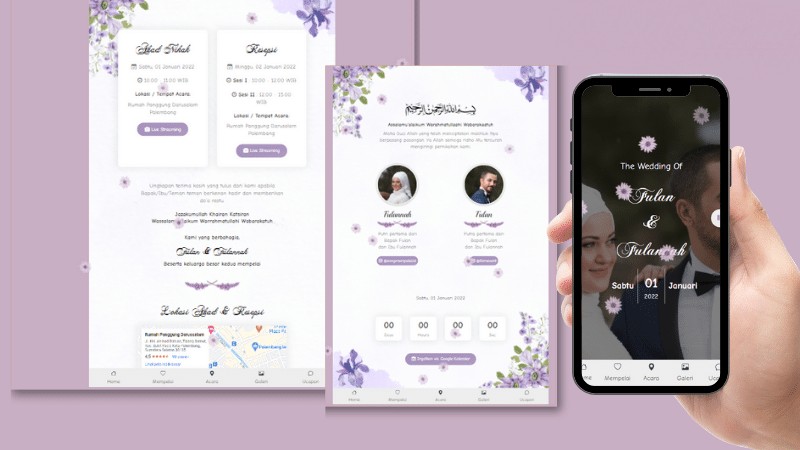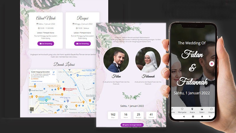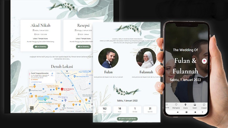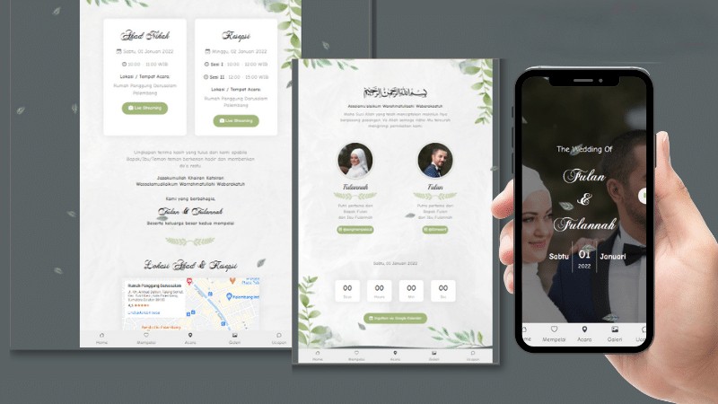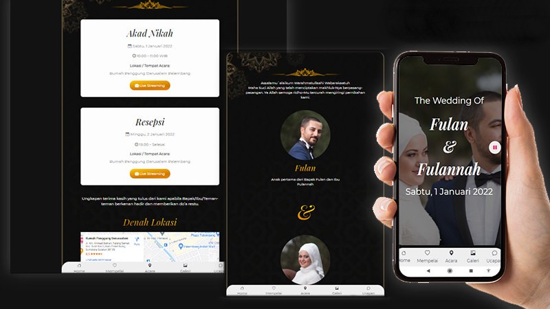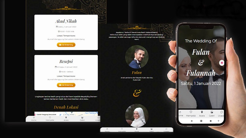 Menampilkan detali acara (akad & resepsi) mulai dari tanggal, jam dan lokasi acara.