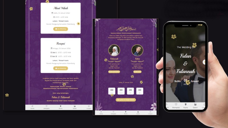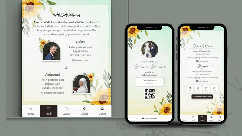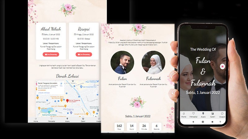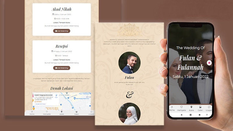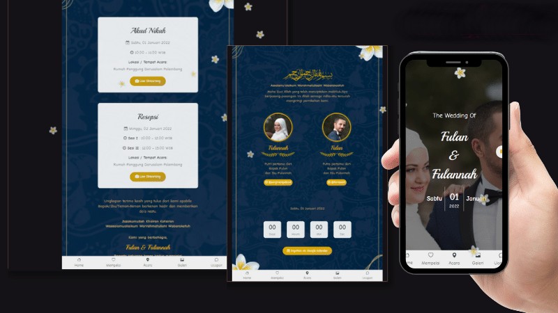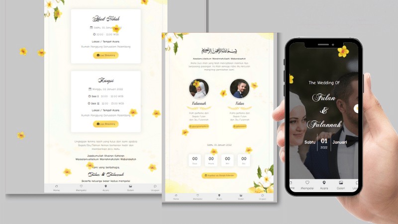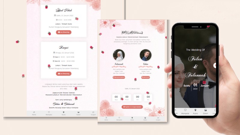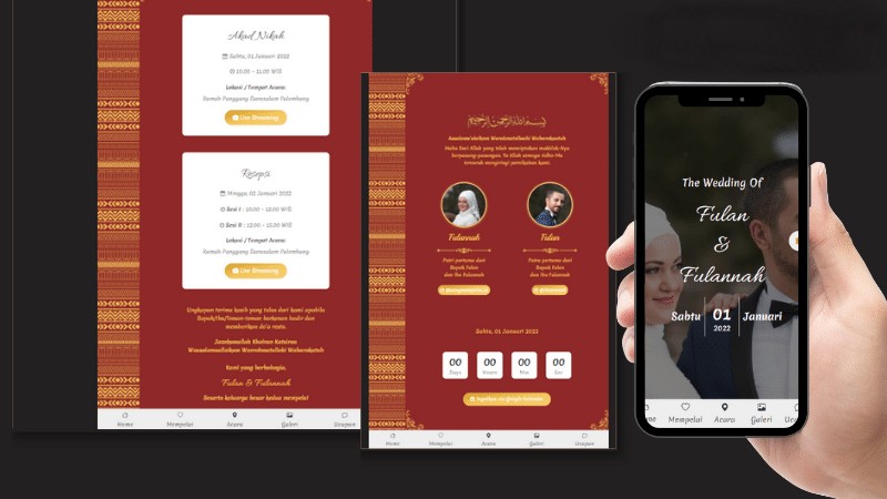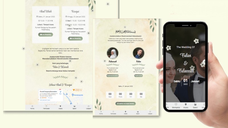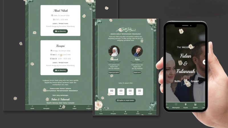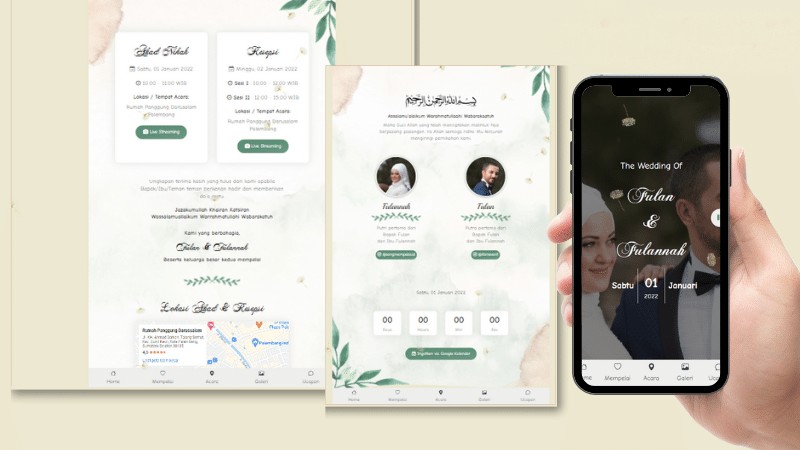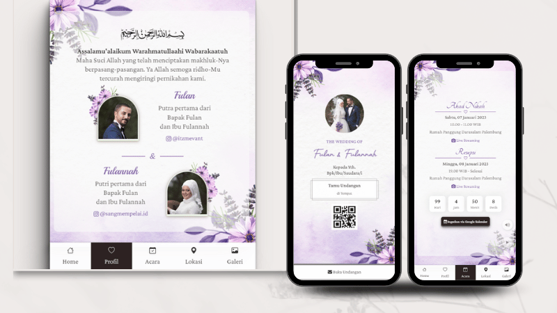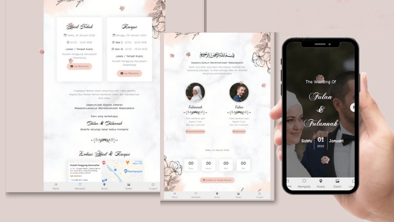 Menampilkan detali acara (akad & resepsi) mulai dari tanggal, jam dan lokasi acara.