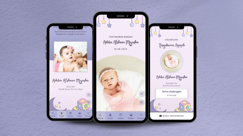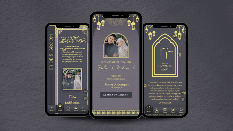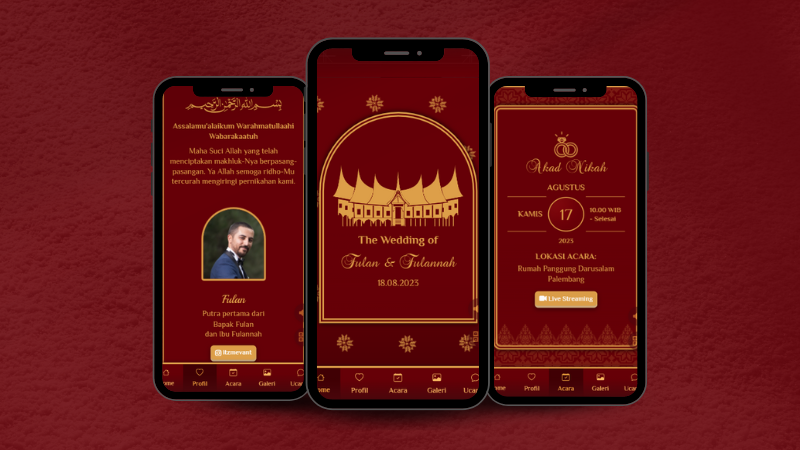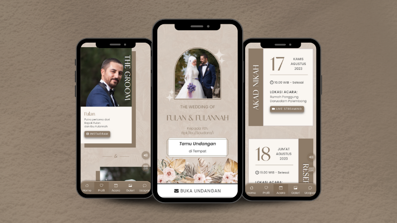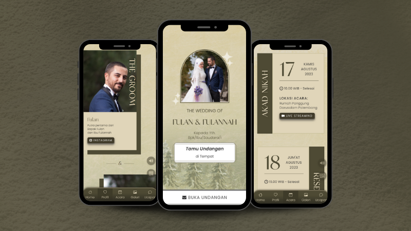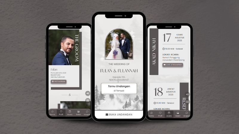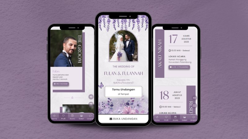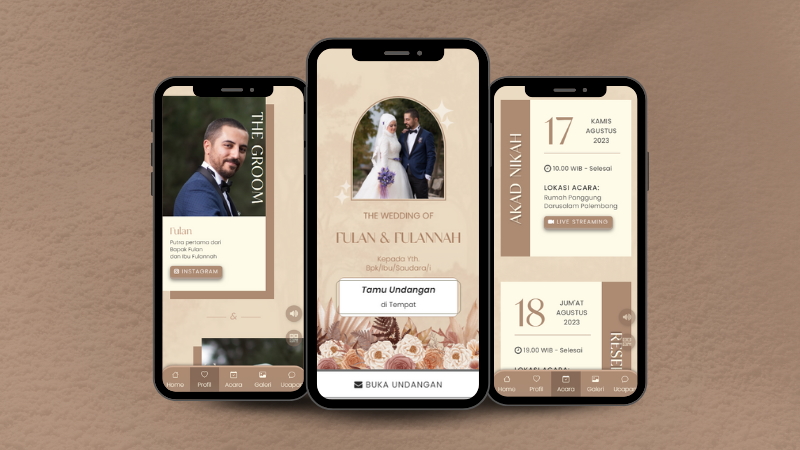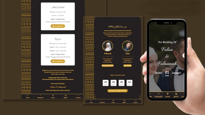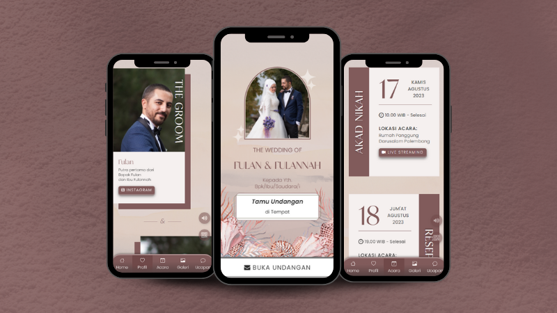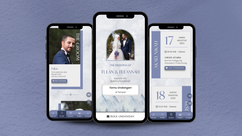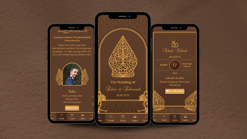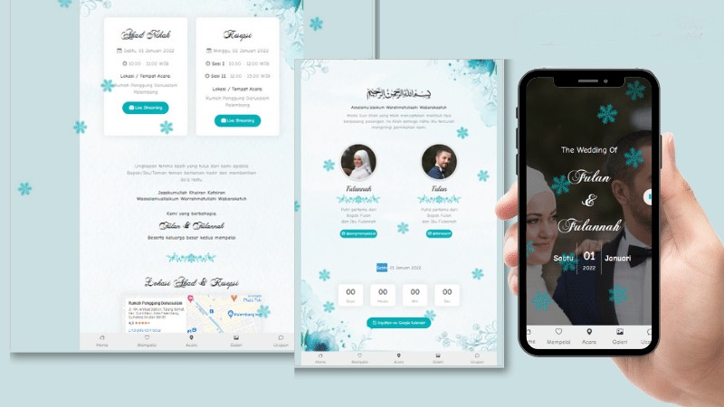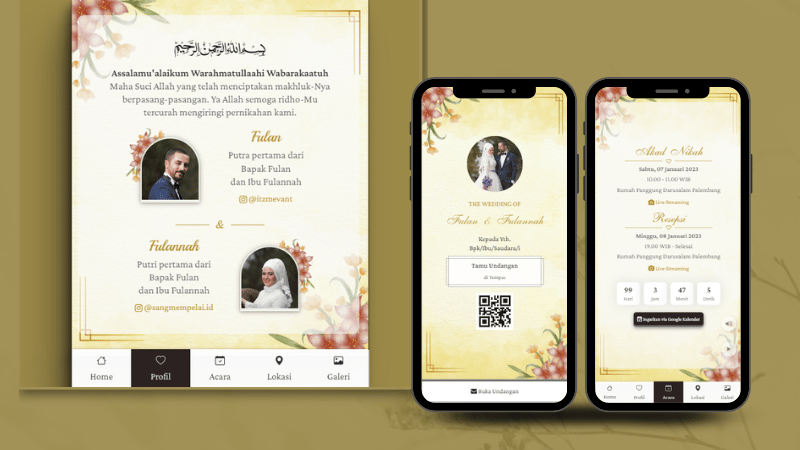 Menampilkan detali acara (akad & resepsi) mulai dari tanggal, jam dan lokasi acara.